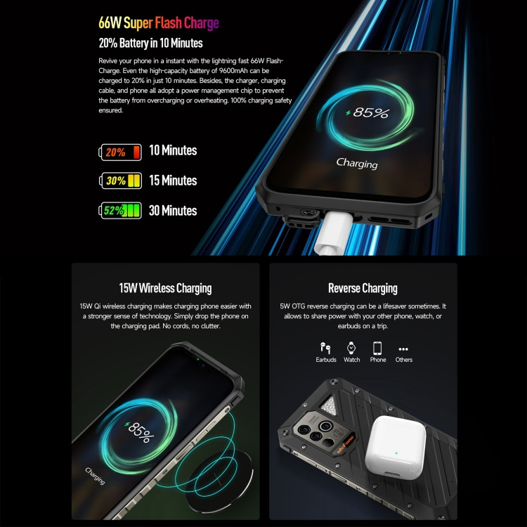 It powered by 9600mAh high capacity li-polymer battery, support 66W superfast charge, that helps you use it all day long.